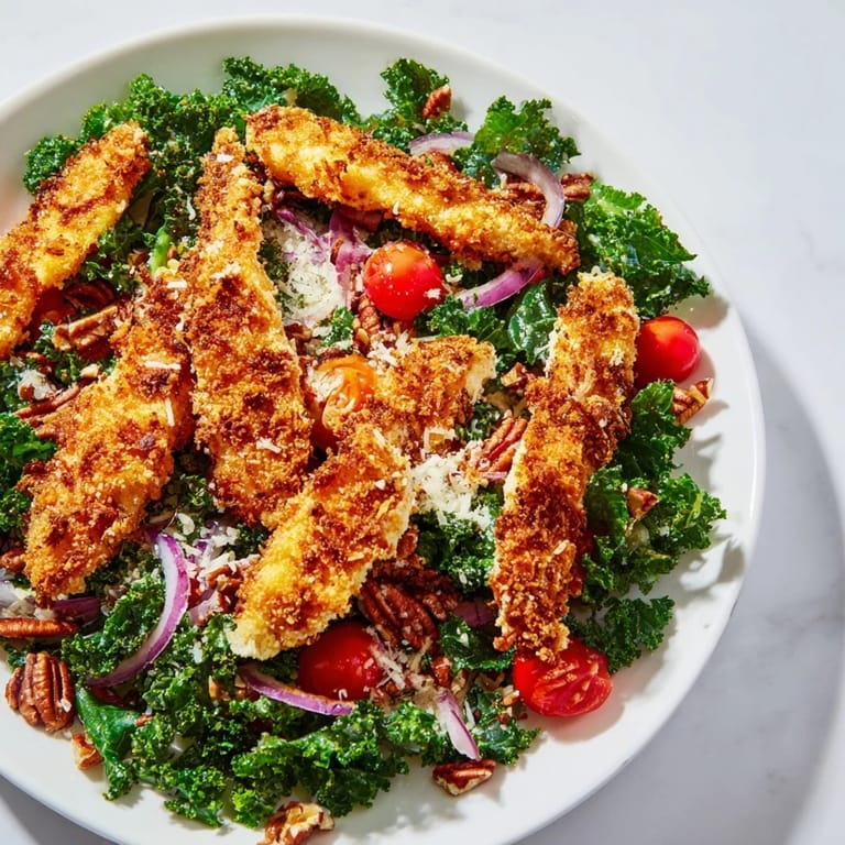 Save The crunch of perfectly fried chicken hitting a bed of dark green kale is one of those sounds that makes everyone in the kitchen turn around. I started making this salad on a Tuesday when I had leftover kale wilting in the crisper and chicken breasts that needed using. What began as fridge clean-out became something I now crave at least twice a month. The maple-Dijon dressing was a happy accident, born from grabbing the wrong bottle and deciding to roll with it. Now I can't imagine this salad any other way.