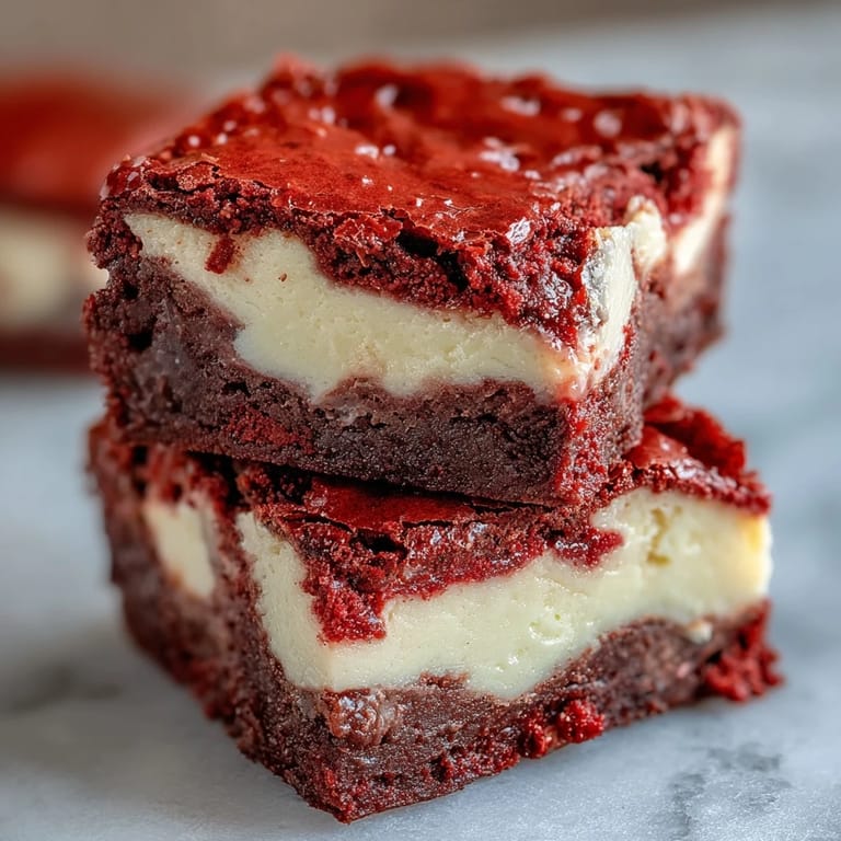 Save My kitchen smelled like cocoa and cream cheese when I pulled these from the oven on a rainy Saturday afternoon. The crimson swirls against the ivory cheesecake looked almost too pretty to cut, but my neighbor had already texted asking what was baking. I sliced into them while they were still warm (a mistake I don't regret), and the fudgy red velvet gave way to tangy cheesecake in a way that made me forget I was supposed to be bringing these to a potluck. Sometimes the best recipes are the ones you have to make twice because the first batch never makes it out the door.