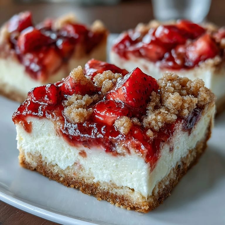 Save My kitchen counter was a mess of butter wrappers and sugar when my neighbor knocked with a basket of strawberries from her garden. I had cream cheese softening for something vague, no real plan, and suddenly these bars came together like they'd been waiting to happen. The smell of cinnamon and butter baking made her stay for coffee. We ate the first batch still warm, breaking all the rules about letting cheesecake chill, and they were gone by noon.